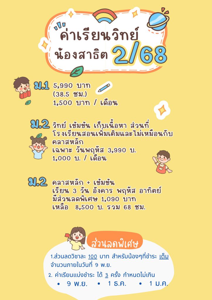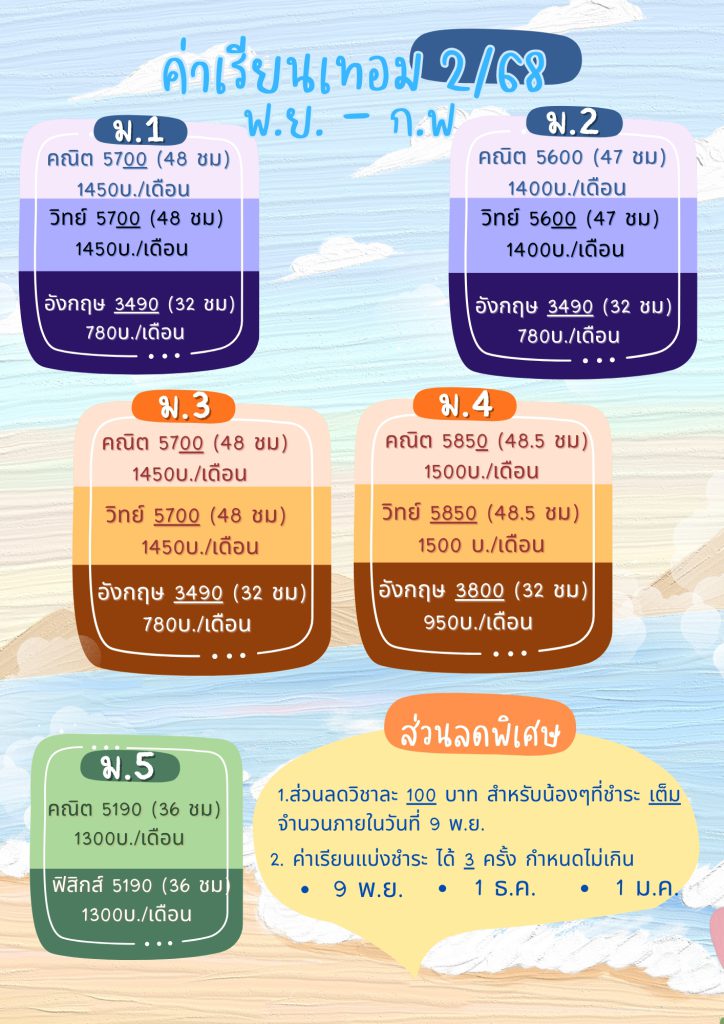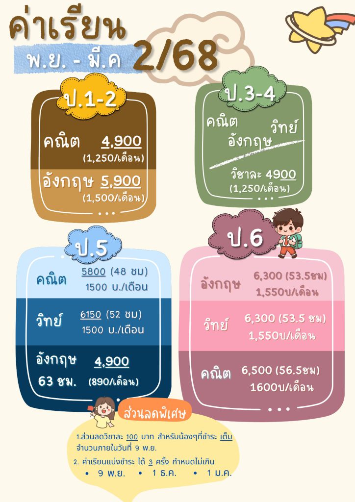 ค่าเรียนน้องๆ ในแต่ละระดับชั้น คอร์สเทอม 2/68